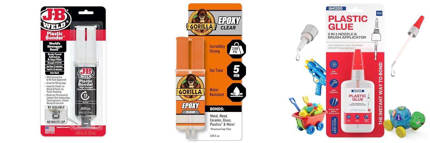- Super Glue (Cyanoacrylate): This dries very fast and is good for small repairs. It works on many plastics but can be brittle.