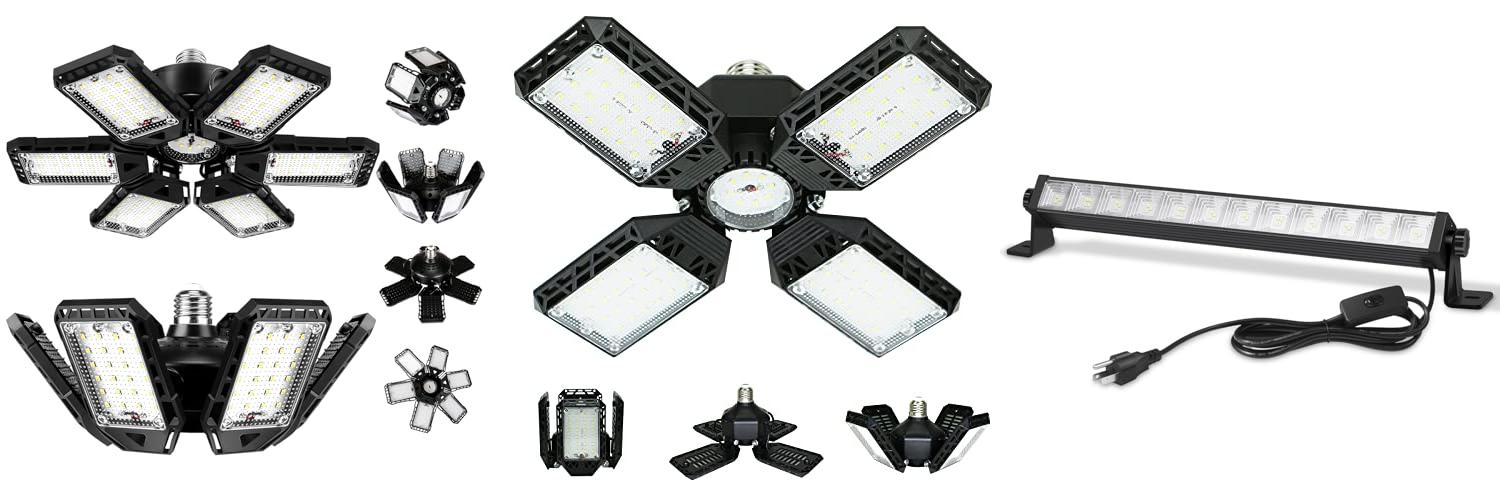 • General Lighting: If you just need to see around your garage, a few bright LED panels or shop lights will do the job.