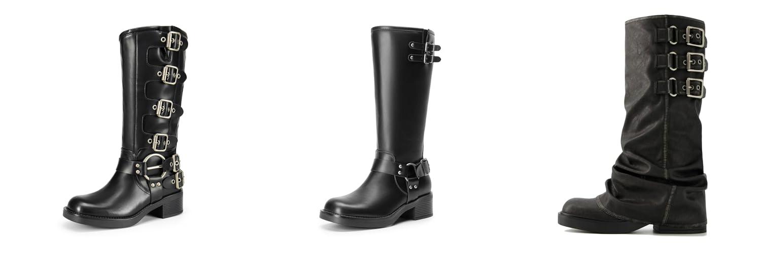 5. Athlefit Women’s Knee High Riding Boots Fashion Buckle Square Toe Chunky Heel Wide Calf Biker Black Boots Size 8