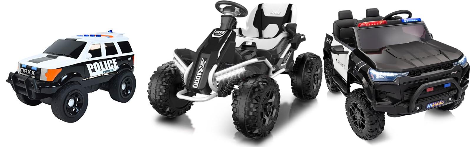 - This police car looks and sounds the part with flashing lights, cool decals, a working microphone for announcements, and even a wireless speaker for music.