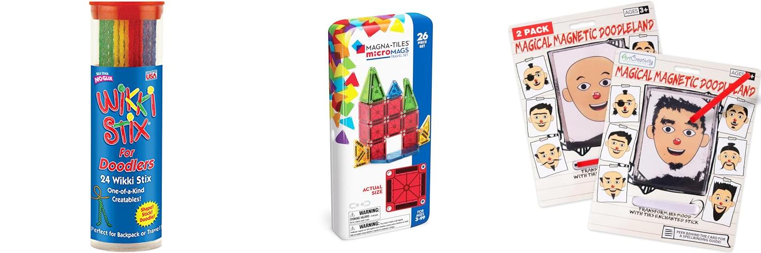 A: Yes! Sticker books, mess-free coloring books (like Water Wow!), magnetic drawing boards, and small fidget toys are great for quiet play on planes.